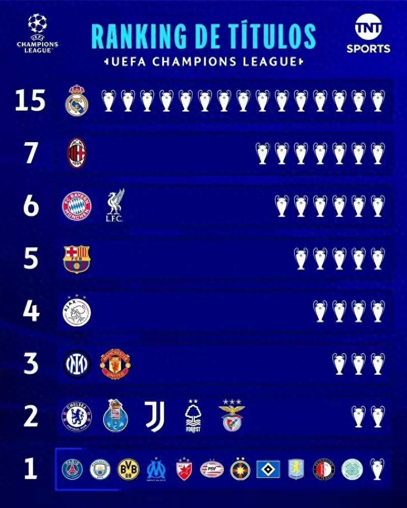 欧冠冠军数排名:皇马15冠领跑 米兰7冠第2 拜仁利物浦6冠第3